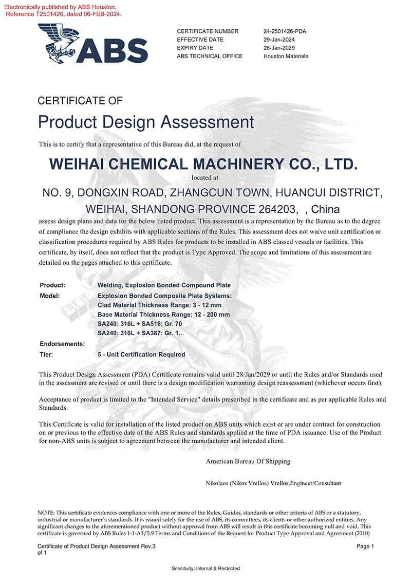 近日,威?;瘷C順利獲得美國船級社(ABS)頒發(fā)的產(chǎn)品設計PDA認可證書,認可產(chǎn)品名稱為“爆炸焊接復合板”,涵蓋產(chǎn)品種類:ASME SA264、ASME SA265、ASTM B898標準…